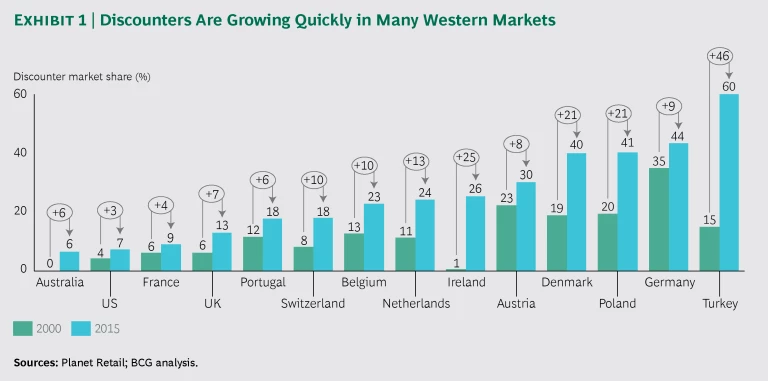 Today, however, that’s no longer true. Discounters grew at a rapid clip from 2000 to 2015, gaining significant market share in many Western countries, including Denmark, Poland, and Turkey. (See Exhibit 1.) That growth shows no signs of slowing, even as household incomes have risen. Worldwide, discounters are projected to increase their number of store locations by 4.4% a year through 2020, compared with just 2.9% for mainstream supermarkets and 1.6% for superstores and hypermarkets. Some regions will see an even faster expansion, including Eastern Europe (more than 30%) and Latin America (approximately 8%).