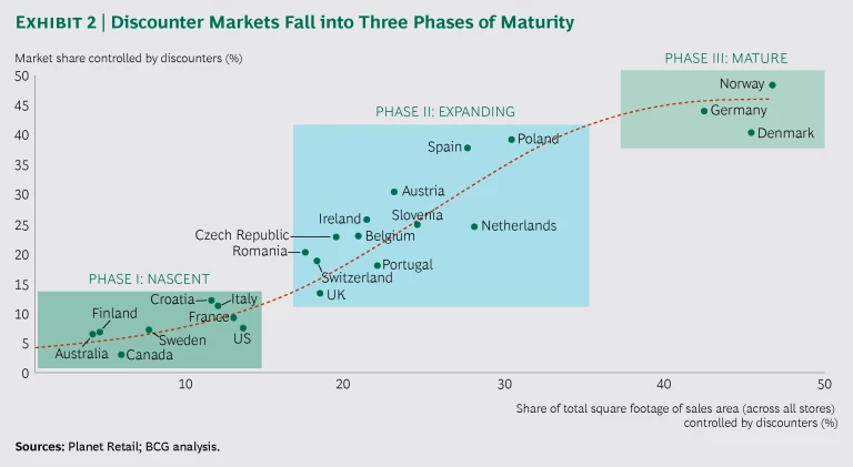 To better understand the dynamics of discounters and how much they will challenge established grocers, we identified three distinct phases of development with different levels of activity and success among discounters: nascent, expanding, and mature. (See Exhibit 2.)