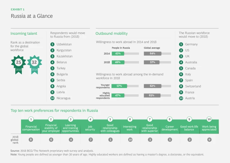 That younger residents and highly skilled individuals are willing to relocate could indicate that the country’s progress toward a knowledge-based economy is taking longer than it is in other large countries, which have more to offer in-demand talent as a result. Russia’s economy remains dominated by state-owned or -affiliated businesses. As such, it lacks the same number of dynamic small businesses and multinational corporations that in other large economies act as major creators of knowledge-based jobs. Knowledge work accounts for only 17% of Russian employment, compared with 29% in Germany and 45% in the The UK Slips as a Hot Spot for Global Talent, according to separate BCG research. (See Russia 2025: Resetting the Talent Balance, BCG report, October 2017.)