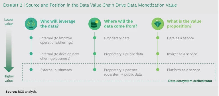 Ideally, an organization will sequence its monetization strategy so that it can use an early mix of quick revenue wins to fund bold transformational moves that take longer to generate returns. But even if a well-conceived data strategy requires sustained investment, its transformative, strategic benefits will massively outweigh the interim cash drain. In any event, whether the monetization strategy is internal or external, the organization needs to understand who will leverage the data, where the data will come from, and what the value proposition is. (See Exhibit 3.)