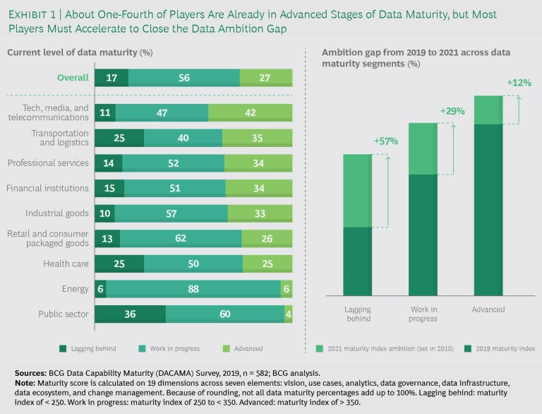 We have documented companies’ struggles with data maturity across industries and geographies. Since 2016, BCG has conducted digital transformation surveys of companies to assess their ability to leverage data. In 2019, we found that only 27% of companies had reached the advanced stage of data maturity, which we calculate based on seven elements: vision, use cases, analytics, data governance, data infrastructure, data ecosystem, and change management. (See Exhibit 1.)