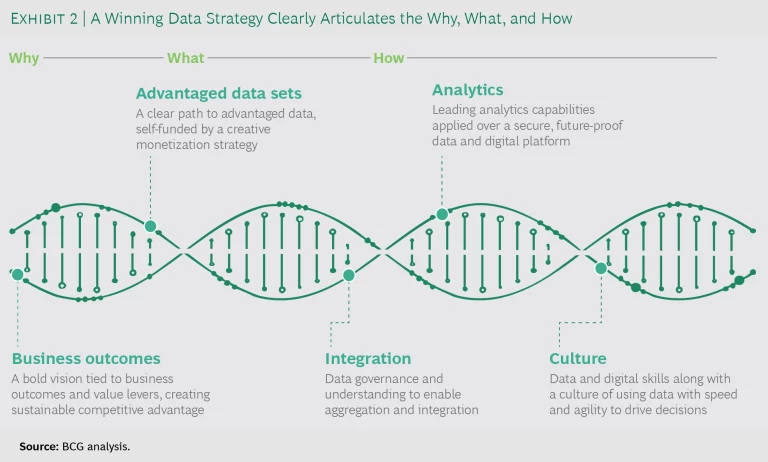 Once a company has identified its advantaged data sets—which link closely with the business outcomes it plans to achieve—it will have a much easier time managing the other parts of the data strategy: defining business outcomes, identifying needed analytics, integrating the data, establishing appropriate infrastructure to retrieve the data, and adapting the corporate culture to use the data optimally. (See Exhibit 2.)