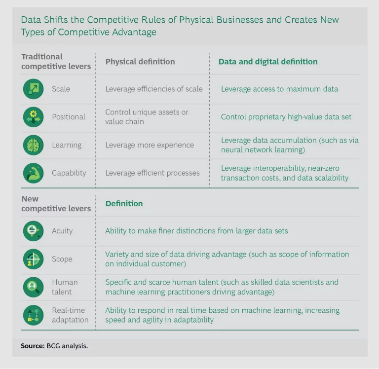 Whether a company is considering creating a new line of business and gathering new data, or reframing business outcomes to make better use of existing data, a holistic data strategy underpinned by advantaged data opens new sources of competitive advantage. Among these sources are acuity, scope, human talent, and real-time adaptation. Advantaged data also redefines traditional levers of competitive advantage. (See the exhibit.)