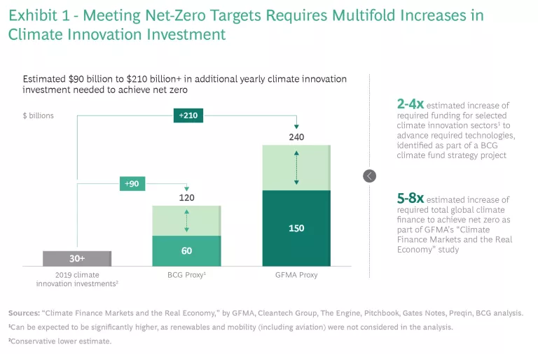 Venture capital and private equity investments in climate innovation have been growing about 14% a year since 2016, with most of the funding going into mobility, renewables, and waste. Investment totaled about $30 billion in 2019 and $37 billion in 2020. But this is not nearly enough. Separate analyses by BCG and the Global Financial Markets Association (GFMA) on global climate finance requirements lead us to estimate that the world is between $90 billion and $210 billion short of the yearly investments in climate-altering technology needed to achieve net zero. (See Exhibit 1.)