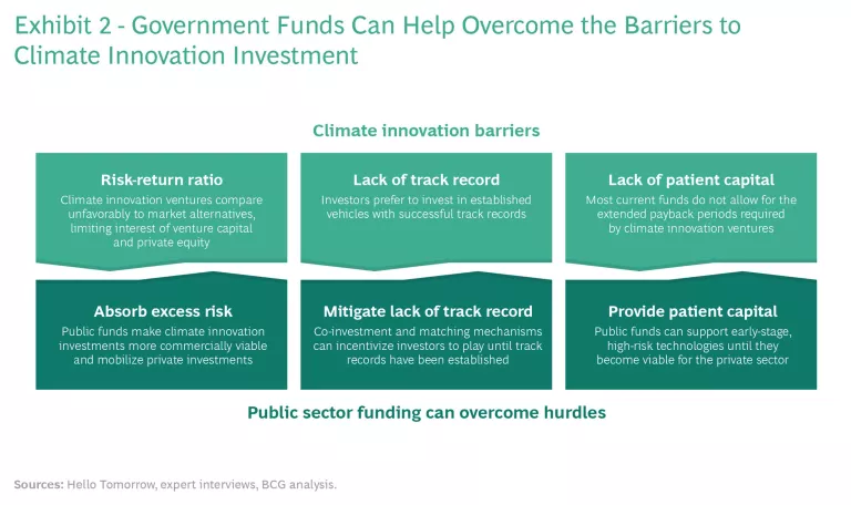 Public funding via co-investment and matching mechanisms helps lower risk perception and mobilize increasing venture capital and private equity investments in climate innovation. Patient public funding can help close current funding gaps by compensating for the impatience of private capital for extended payback cycles and lengthy public funding processes.