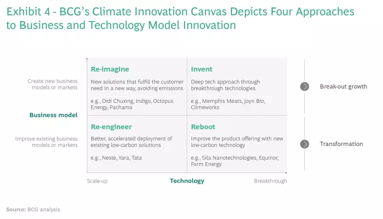 In our analysis of how the private sector can most effectively pursue climate innovation opportunities, we developed a matrix of four areas of effort, which we call the climate innovation solutions canvas. (See Exhibit 4.) Combining the canvas with the three country criteria provides a means for governments to target their climate investments. For example, large industrial nations, which have the most relevant options, need new technologies, including high-risk breakthrough approaches. This points their investments toward backing the invent and reboot quadrants of the canvas. They can also provide funding and ecosystem support for scaling up technologies in the re-imagine and re-engineer categories, prioritizing the most promising investment opportunities.