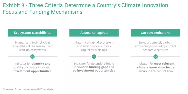 The level of need is guided by three main criteria. (See Exhibit 3.) The first is the current state of the country’s climate innovation ecosystem—the human and technological capabilities of its research institutions and start-up ventures. This serves as an indicator for the quantity and quality of climate innovation investment opportunities. Next comes access to capital, an indicator for potential climate innovation funding gaps and co-investment opportunities. Third is the level of domestic carbon emissions produced by current economic activities, which points to the most pressing areas of focus.