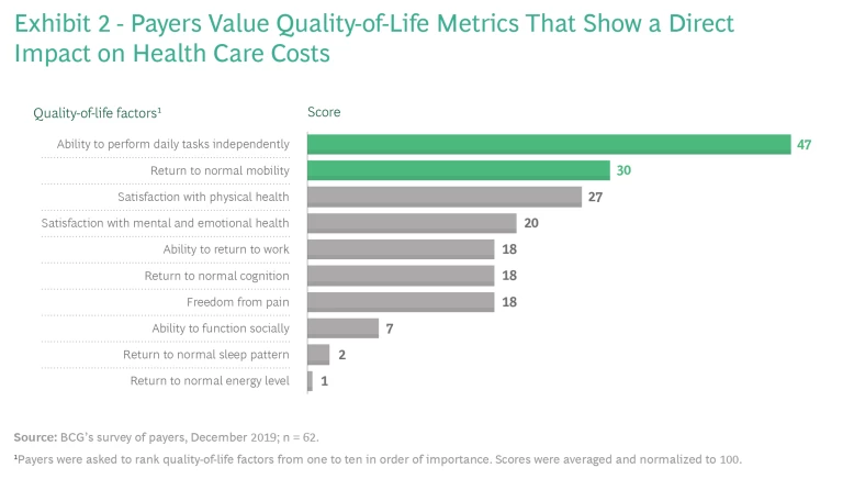 Even so, providing quality-of-life benefits doesn’t always translate into coverage and improved patient access because payers usually care most about clinical efficacy and cost. Payers typically evaluate efficacy using what they consider to be objective measures of endpoints specific to the disease, such as living longer and physiological improvements assessed through diagnostic tests. And because payers are focused on costs, to gain coverage, therapies that enhance patients’ quality of life need to demonstrate improvements in the total cost of care, such as by reducing the number of hospital readmissions or by increasing patients’ ability to perform tasks independently and avoid nursing care. (See Exhibit 2.)