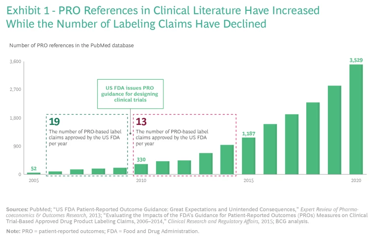 Researchers have used patient-reported outcomes (PROs) to assess improvements in patients’ quality of life for decades. Over time, PROs increasingly became important for R&D, clinical trials, and US Food and Drug Administration (FDA) approvals. In cases where PROs were clinically validated—sometimes across hundreds of thousands of patients—the data was quite robust. Consequently, references to PRO data in clinical literature exploded from 2005 through 2020.