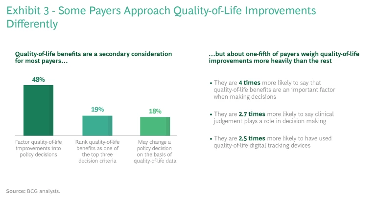 It’s important for pharma and medtech companies to understand that not all payers approach quality-of-life issues in the same way. (See Exhibit 3.) For example, on the basis of our interviews, payers that focus on employer-sponsored health insurance tend to weigh quality-of-life outcomes more heavily than other commercial payers; that’s because employers usually take employees’ complaints about coverage quite seriously. Other commercial payers will sometimes provide coverage for therapies that enhance patients’ quality of life, but they are more likely to enforce utilization controls, such as higher co-pays, on patients.
