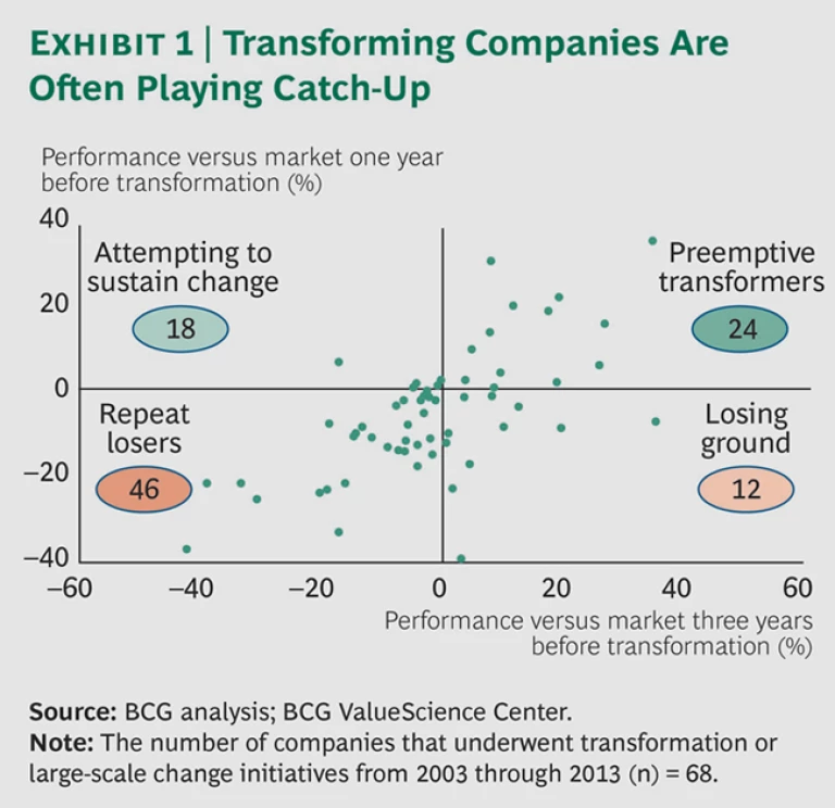 And while transformations are increasingly common, we know that about 75 percent of such efforts fail to restore long-term growth and competitiveness. Logically, that’s hardly surprising: jumping is inevitably riskier than walking, especially when the bar is high. And often the company’s focus is on healthy quarterly earnings rather than sustained competitiveness, encouraging management to adopt a stance of “if it ain’t broke, don’t fix it.” Waiting until performance is already declining, however, not only increases the magnitude of the required adjustment and the organizational difficulty of realizing it but also puts companies in a reactive position, causing them to miss opportunities for preemption, experience building, leadership, and, ultimately, competitive advantage.