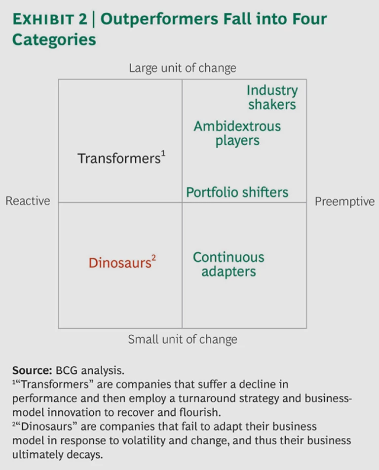 Most important, these steady performers have not achieved consistent success by staying the same. (See Exhibit 2, which contrasts these companies’ orientations with those of two types of more reactive, and ultimately far less successful, businesses: transformers and dinosaurs.) Their distinct approaches to remaining dynamic draw on a common menu of elements: