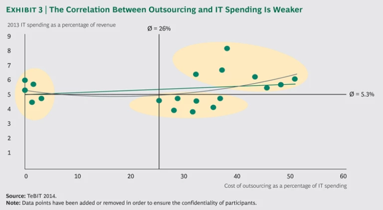 Past TeBIT surveys had thrown some water on the idea that outsourcing means lower costs. In fact, analysis of the data suggested just the opposite. For several years running, we found a direct linear correlation between a high degree of outsourcing and high IT spending (measured as a percentage of revenue). This year, however, the correlation was noticeably weaker. (See Exhibit 3.)