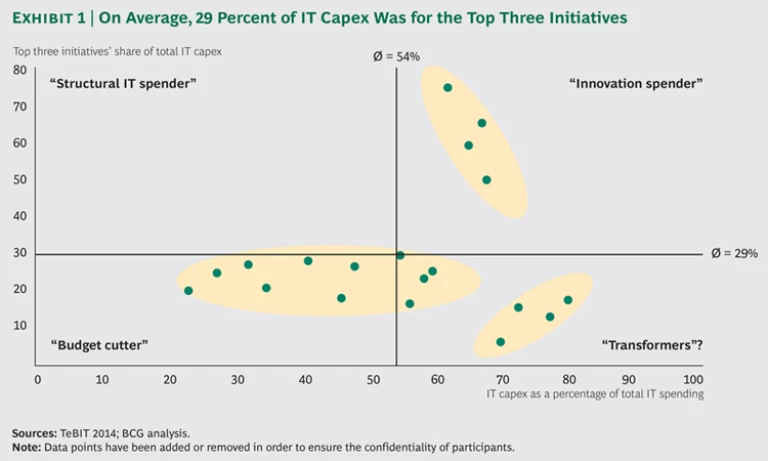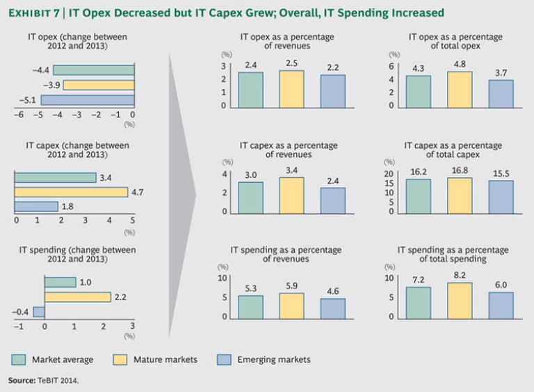This year’s findings show IT units continuing their shift in focus from cost reduction to innovation—a strategy that increasingly looks like the right idea at the right time. But the data also suggests that telcos might, in effect, be able to have their cake and eat it, too: reducing operating expenses even as they increase capital expenditures. That would mark a break from past cost cycles, but perhaps that is only fitting, too. For telcos, future growth will mean breaking from older ideas on how, and where, to build business. ETIS and BCG believe that benchmarking and open exchange on past experience can help them do that—successfully, efficiently, and soon.