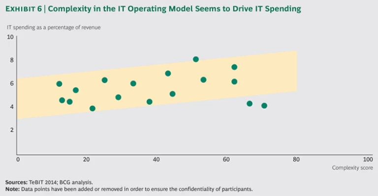 Overall, complexity, as one would expect, does appear to drive costs. Taking into account various factors that push complexity in one direction or the other—such as the number of freelancers a telco has to manage and the degree to which it leverages outsourcing—each participant in the TeBIT benchmark was assigned a “complexity index” from 0 to 100. Higher index scores did indeed correlate to higher IT spending, measured as a percentage of revenues. (See Exhibit 6.) But when we drilled down to individual drivers—looking at each complexity factor in isolation from the others—things became more nuanced. Not every driver moved the dial equally.