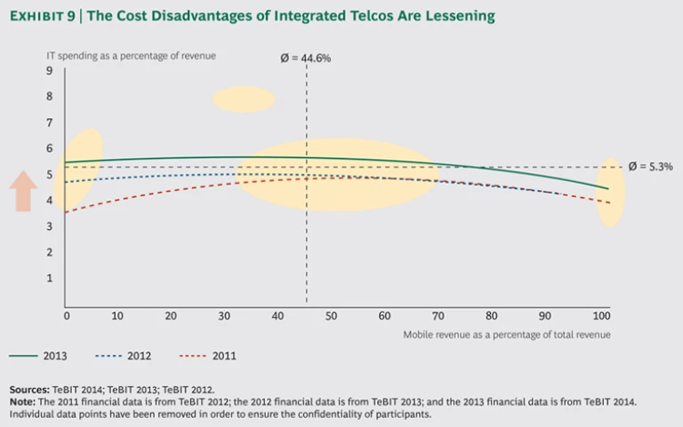 This year’s data also showed the traditional cost disadvantages of integrated providers continuing to lessen. Once saddled with the burden (and cost) of managing separate IT infrastructures for mobile and fixed, integrated telcos finally seem to be making progress consolidating their systems into a single platform. (See Exhibit 9.)