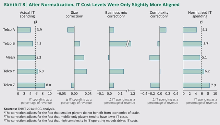As in previous years, we also saw significant gaps in IT cost levels among participating telcos, ranging from 3.9 percent to 8.0 percent of revenues. The difference this time was that TeBIT’s “normalization” analysis—intended to enable a more “apples-to-apples” cost comparison by accounting for differences in company size, business mix (fixed-only, mobile-only, or integrated), and IT complexity—did not narrow the gap to the extent seen in the past. In fact, after normalization, IT cost levels were only slightly more aligned. (See Exhibit 8.) One explanation for this could be telcos transitioning from cost-cutting mode to investment mode at slightly different times—some switching a bit earlier or a bit later than others. In that case, cost levels would temporarily be out of sync, but would become much more consistent once all telcos have moved into their investment phase.