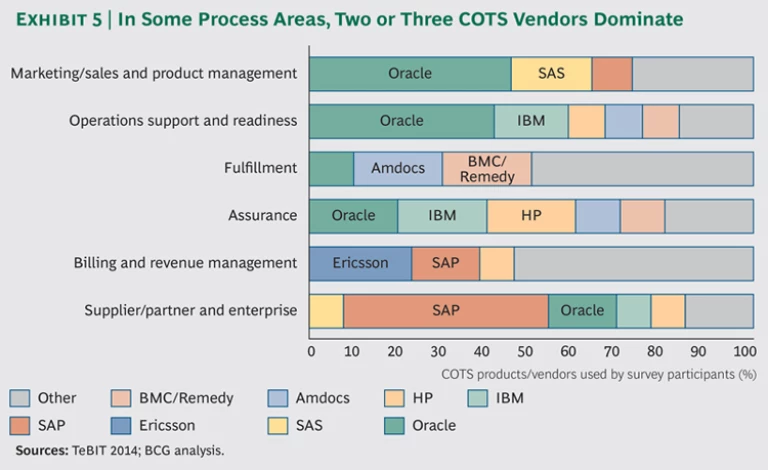Meanwhile, COTS software is also seeing its traction vary from one IT process to another. For supplier/partner and enterprise (including enterprise resource planning, or ERP) as well as billing and revenue management, COTS usage accounts, on average, for approximately 50 percent of the work. For fulfillment, on the other hand, the figure is closer to 20 percent. The data also confirmed that in some areas—like ERP, CRM, and product management—two or three COTS vendors dominate. For instance, more than 60 percent of participants use SAP or Oracle for ERP. Other areas, such as billing and revenue management, assurance, and operations support and readiness, were far more fragmented. (See Exhibit 5.)