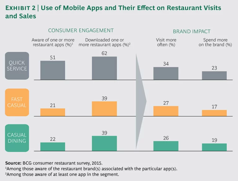 Not all brands have achieved the same degree of engagement, however. Best-in-class companies have mobile app adoption rates as high as 60%, while adoption rates among lagging brands can be as low as 10%. At the high end, the quick-service segment is leading the way in awareness, adoption, and usage. More than 50% of consumers are aware of at least one quick-service restaurant’s mobile app, and more than 60% of those consumers have downloaded at least one of them. (See Exhibit 2.) Casual dining and fast casual trail quick service—but even in these segments, nearly 40% of those who are aware of at least one mobile app have downloaded one. Higher awareness and adoption in quick service reflect the fact that digital has been widely used to solve fundamental operational challenges related to speed, whereas in casual dining, many applications of digital to date have focused more on the periphery than on core operational issues.