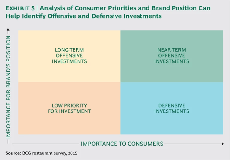 Making Offensive and Defensive Investments. By analyzing what matters most to consumers and to the brand’s market position, a company can also set its priorities for making offensive and defensive investments in digital. (See Exhibit 5.) Offensive investments are used to build new competitive advantage or industry leadership; they should focus on enhancing the technical requirements that are of greatest importance to consumers and to the need state that the company wants to satisfy. Defensive investments are primarily intended to protect share or keep up with industry table stakes; they should focus on technical requirements that are important to consumers but less critical to satisfying the targeted need state. This framework can guide brands as they develop an investment model for capturing their desired ROI. It can also help management explain investment rationale, targets, and time frames to investors.