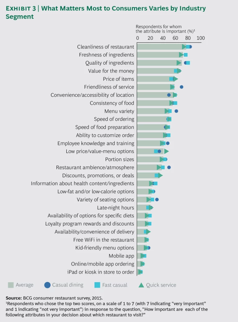 What Consumers Want. Since digital channels are first and foremost about broadening and deepening customer engagement, investments should focus first on what matters most to consumers—which, of course, is their experience with the brand. Some of the factors that make up this experience are similar across all restaurant brands: the cleanliness of the restaurant or the friendliness of the staff, for example. The significance of other factors, such as speed and fresh ingredients, varies by brand and segment. (See Exhibit 3.) In the quick-service segment, technical attributes relating to low prices and discounts, delivery, convenience, and late hours are more important to consumers than they are in other segments. In the fast-casual segment, ingredient quality, offerings that meet dietary requirements, and the availability of a mobile app and loyalty program rewards take precedence. In casual dining, wait time before seating, seating variety, restaurant atmosphere, and menu variety are more important.