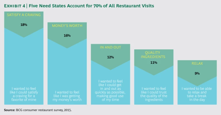 What Brands (and Consumers) Need. Digital investments must also support the “emotional need states” in which a brand seeks to beat the competition. Need states describe how consumers want to feel when they visit a restaurant and, therefore, what they expect the restaurant to deliver. Our research shows that need states are the single biggest factor in choosing a restaurant. (See Casual Dining: How Brands Can Pivot from Irrelevance to Growth, BCG Focus, November 2014.)