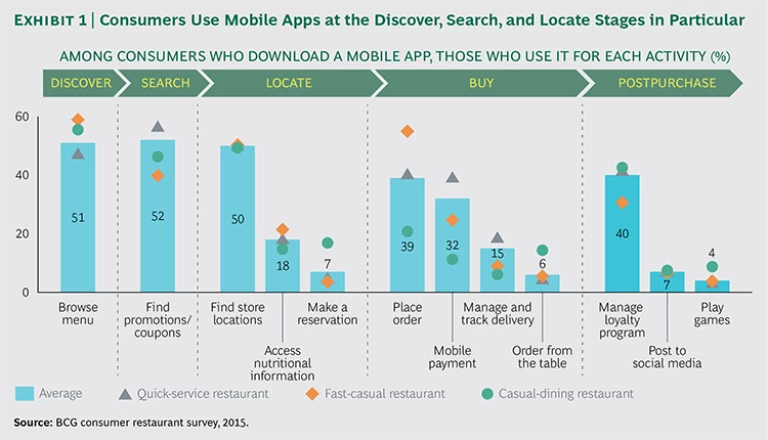 In the discover, search, and locate stages of the consumer journey, half or more of those who have downloaded mobile apps use them to browse the menu, check for promotions, or find restaurant locations. (See Exhibit 1.) We expect this number to grow as restaurants and third-party services add features. For example, Outback’s CEO, Elizabeth Smith, says her brand’s new app will “solve a lot of pain points; it’s going to allow you to virtually check in to see where you are in the wait list, to pay at the table, and go.”