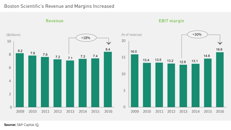 Overall, profits are now strong and growing in all of Boston Scientific’s business units. Revenue is up nearly 20% since 2013, and EBIT margins are up 30%. (See the exhibit.) Shareholders have benefited: the company’s market cap has nearly quintupled in that period. “Our strategy of category leadership in key markets and diversification into high-growth adjacencies is working, and enabling continued investment in innovative medical technologies,” said chairman and CEO Michael Mahoney.