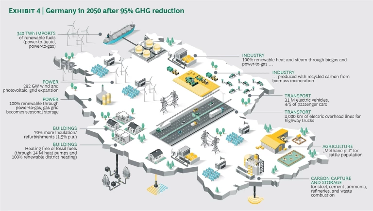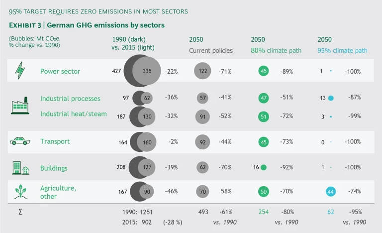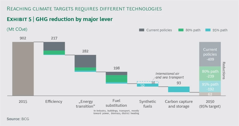 - 95 percent GHG reduction would push the boundaries of foreseeable technical feasibility and current social acceptance. Such a reduction (three quarters more than the 80% path) requires practically zero emissions for most sectors of the German economy. In addition to more or less phasing out all fossil fuels