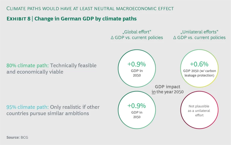 - The 80% climate path would even have a slightly positive to neutral GDP impact in case of a unilateral German emission reduction effort, assuming optimal implementation.
