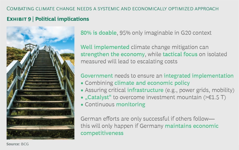 - At the same time, the imminent transformation process presents Germany with significant implementation challenges. The considered climate paths are economically cost-efficient and are based on the assumption of ideal implementation, meaning optimization across sectors and "right decisions being made at the right time." Mismanaging the implementation (think of excessive feed in-tariffs and delayed grid expansion in case of Germany’s “Energiewende”) could considerably increase costs and risks or even render the goal unattainable.