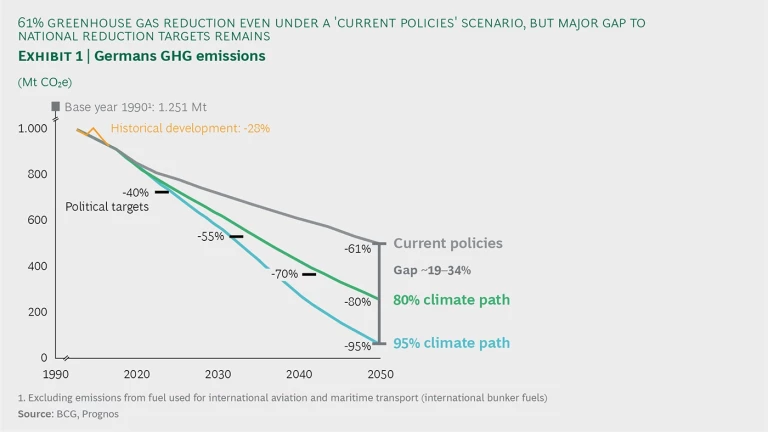 - Emissions will be cut further over the next 35 years. Under a current policies path, Germany's national emissions will decline by approximately 61 percent by 2050 compared to 1990. This leaves a significant gap of approximately 19 to 34 percentage points to the government goals of 80 to 95 percent GHG reduction. The emissions remaining in 2050 under this scenario thus still amount to approximately two to eight times the targeted "residual quantities" (20 percent or 5 percent compared to 1990).