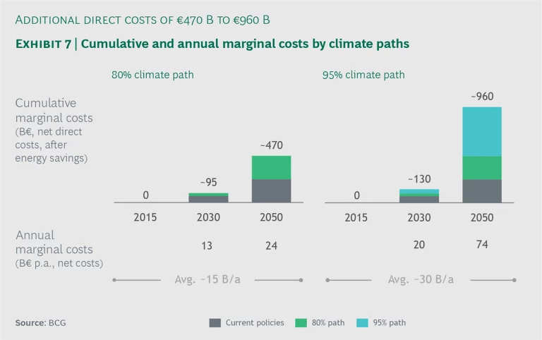 - Many of these investments are at least partly counterbalanced by energy cost savings. Assuming optimal implementation, the resulting additional direct macroeconomic costs of the 80% and 95% climate paths amount to €230 billion to €720 billion by 2050 across all sectors. In addition, costs for non-economic measures in the current policy path amount to approximately €240 billion. Overall additional direct costs therefore total €470 billion to 960 billion by 2050—on average around €15 billion to 30 billion per year.