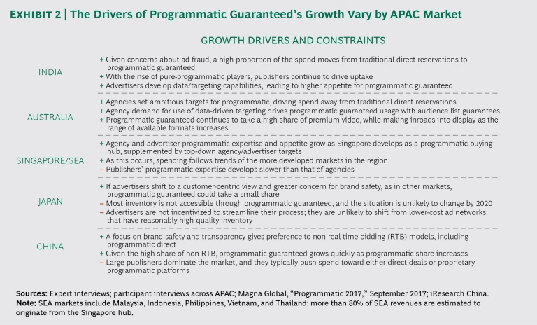 The following sections and Exhibit 2 give a market-by-market rundown of the current state of programmatic guaranteed, the factors affecting its penetration, and the implications for advertisers, agencies, and publishers.