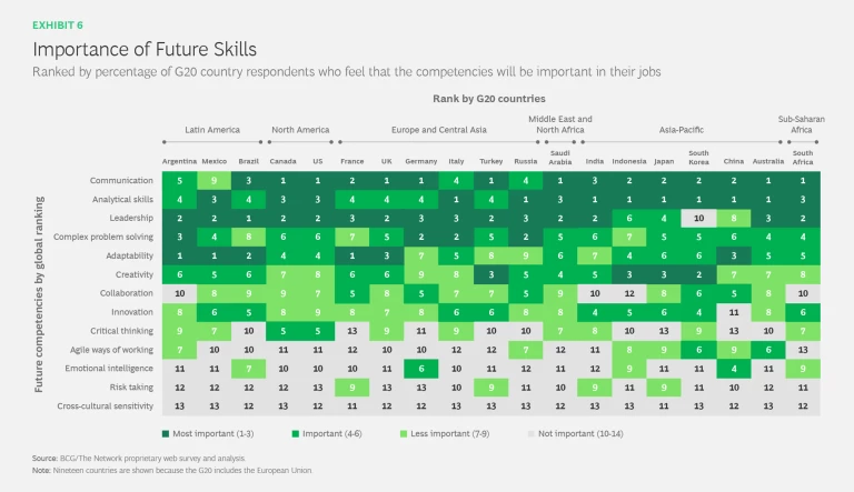 To excel in the future, people worldwide believe, they will need to be multifaceted so that they can be both good collaborators and critical thinkers. They place the greatest importance on having solid communication and analytical skills, followed by improving their leadership and complex problem-solving skills. (See Exhibit 6.)
