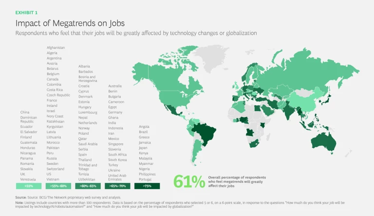 We found that across the globe, people are aware of changing ways of working. An average 61% of respondents believe that their current positions will be greatly affected by technology change or globalization. (See Exhibit 1.)
