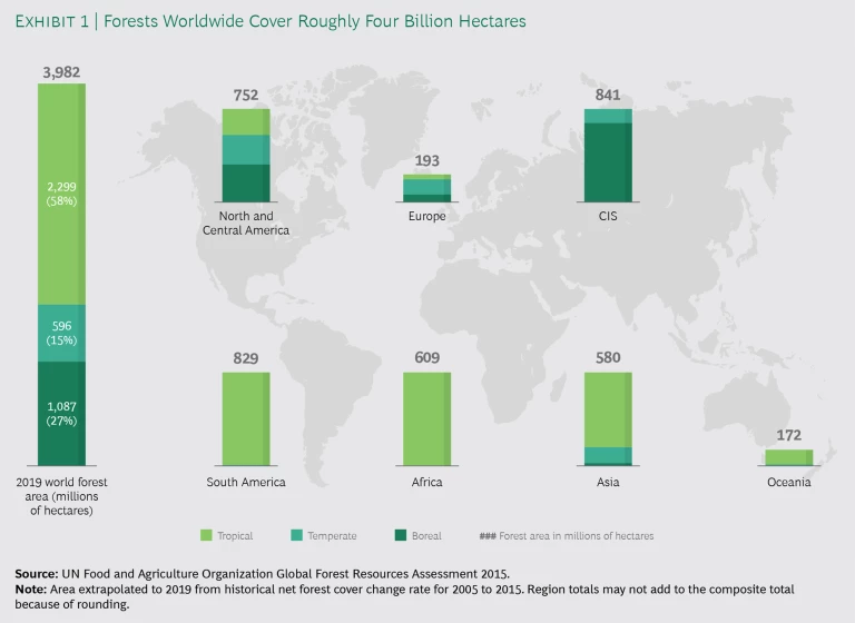 Forests today cover nearly 4 billion hectares around the world. They are found in almost every region, but their sizes and compositions differ greatly among continents and countries (See Exhibit 1.) Five countries jointly account for more than half of the global forest area: Russia (20%), Brazil (12%), Canada (9%), US (8%), and China (5%).