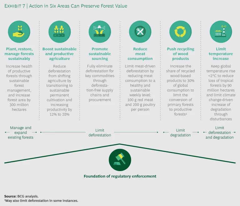 The current range of threats to forests around the world requires aggressive and immediate action by all stakeholders. Concrete actions can be taken today to address these threats. We zeroed in on actions in six areas that can have significant impact. These actions take aim at the threats outlined above, either directly (by restoring forest area, for example) or indirectly, by reducing the drivers of deforestation. (See Exhibit 7.)