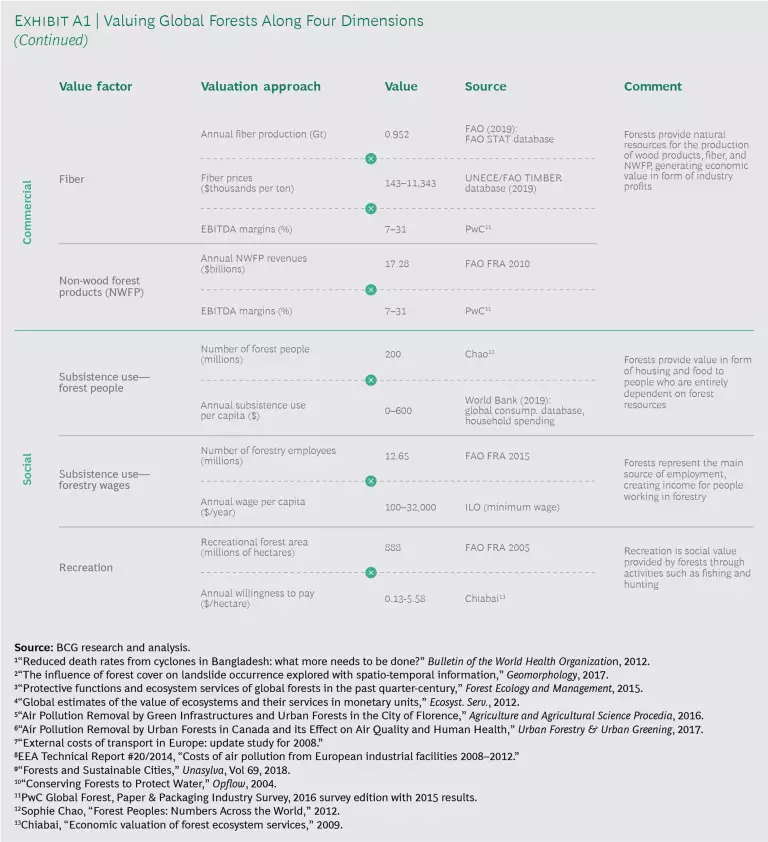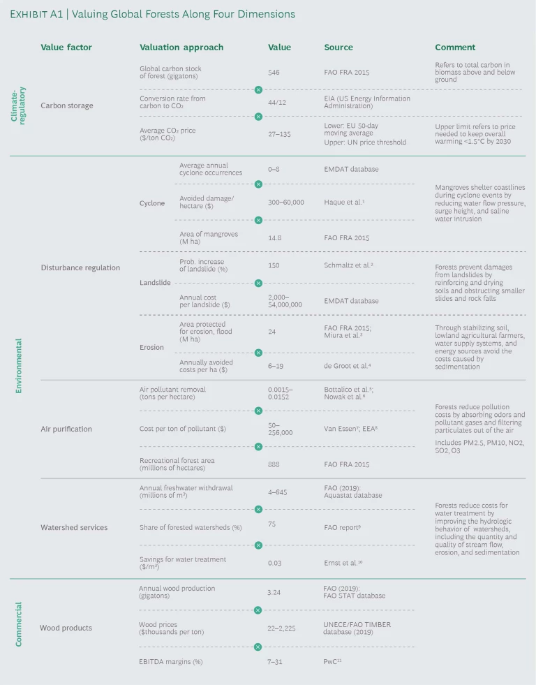 Our analysis addresses the value of forests across four attributes: their climate regulatory function; their environmental benefits, such as air purification and water filtration; their commercial output; and their social value. We realize that quantification of these dimensions is difficult, and certainly always imperfect. For example, the value of forest biodiversity cannot fully be captured. Nevertheless, we believe that a valuation is essential in order to create transparency with respect to the value of forests in comparison with other assets and thereby introduce clarity to a discussion that is often dominated by emotion.