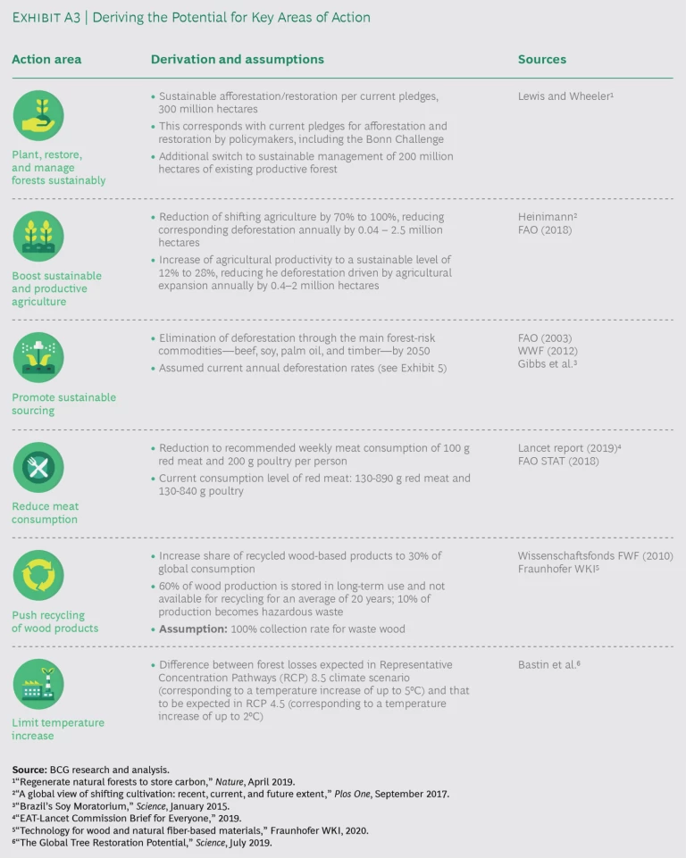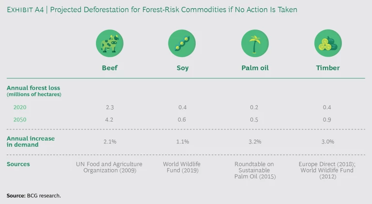 Three areas for action tackle the deforestation driven by forest-risk commodities (beef, soy, palm oil, and timber), and they do so from three different angles: boosting sustainable and productive agriculture, promoting sustainable sourcing, and reducing meat consumption. To quantify the impact of these three levers, we project the loss of forest due to unsustainable sourcing of each of the four forest-risk commodities. Our projections are based on historical and/or projected data. (See Exhibit A4.)