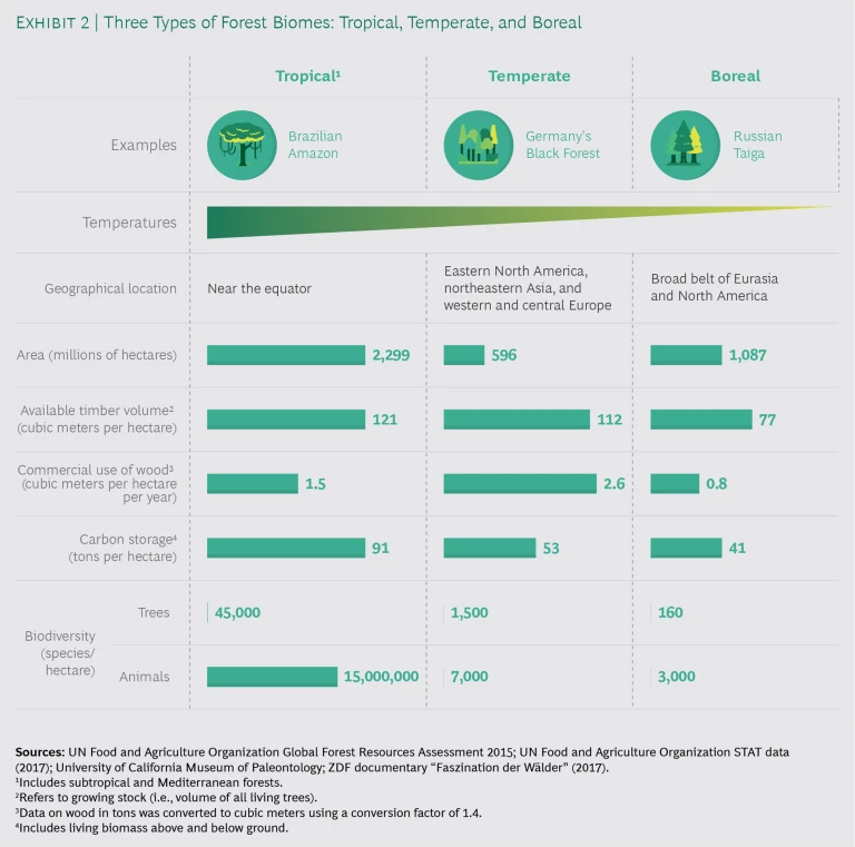 Tropical forests can capture and store more carbon in their biomass than other forest types owing to their fast-growing and very dense trunks, canopies, and roots. In addition, thanks to the mild climate in which they grow and the fact that much of their acreage remains undisturbed, they are the most biodiverse, providing a home for many more species than do the other two biomes. Temperate forests, meanwhile, are the smallest biome (accounting for 15% of total forest area) but account for an outsized share (29%) of global forest product output. That’s because they’re generally more easily accessible than the other types of forests, are relatively dense compared with boreal forests in particular, and are often managed using processes that make them highly productive. (See Exhibit 2.)