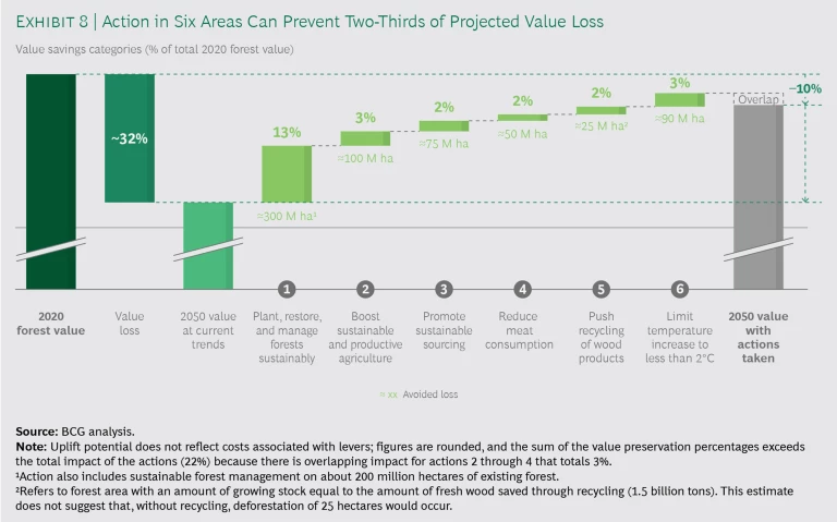 As detailed below, we have based our projections on ambitious but feasible assumptions. Those assumptions largely reflect existing commitments and goals as outlined by players in the global community. Under this scenario, forest value loss can be reduced from roughly 30% to 10%. That equates to the preservation of $30 trillion in value—an amount roughly six times the combined value of Apple, Microsoft, Amazon, Alphabet, and Facebook. (See Exhibit 8.) Given that the overall value does not include components such as biodiversity, it is likely the value preserved through these measures could be even higher.