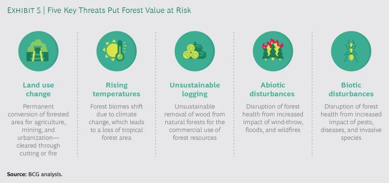 Forests are disappearing at a rapid pace—we lose an area equivalent to 40,000 soccer fields every day. These heavy losses are driven by a number of threats that destroy the value of forests through deforestation, degradation, or both. (See Exhibit 5.) We studied each threat and, extrapolating from current trends, calculated the potential impact each is likely to have on forest value between now and 2050.