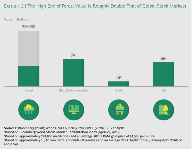 Our analysis reveals that the total value of forests is $50 trillion to $150 trillion—with the upper limit being roughly double the value of global stock markets and more than ten times the value of the world’s gold, including reserves. (See Exhibit 3.) It is worth noting that this is a conservative estimate; we consistently used figures based on academic consensus or, where none existed, the most conservative values in our calculation. (For details on the data and sources used in our calculation, see the appendix.)