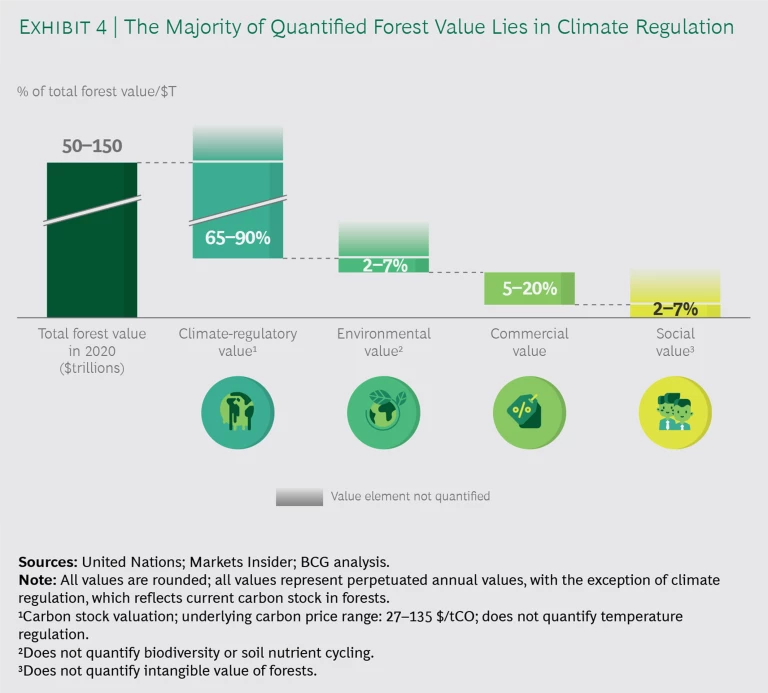 The largest share of forests’ total value—between 65% and 90%—lies in their climate-regulatory function. Commercial value accounts for the next largest share, and environmental and social value account for the remaining portion in equal amounts. (See Exhibit 4.)