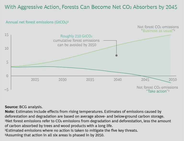 Our modeling shows that forest emissions could swing between two extremes between now and 2050, depending on the measures we take.25 (See the exhibit “With Aggressive Action, Forests Can Become Net CO2 Absorbers by 2045.”)