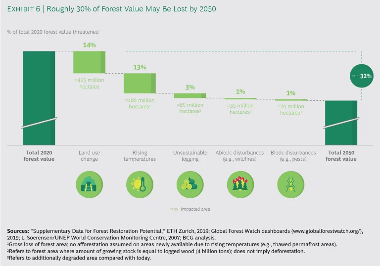 Our analysis yielded sobering results. On the current trajectory, one-third of forest value will be lost by 2050. The major culprits: land-use change and rising temperatures. (See Exhibit 6.) Although wildfires are responsible for 23% of annual forest loss, most of this is temporary loss. Understandably, wildfires often dominate the news, but they are likely to account for less than 1% of forest value destruction over the next thirty years. In general, tropical forests, which account for a large portion of overall value, face the greatest potential loss, with land-use change and rising temperatures the biggest threats. Temperate and boreal forests are also at risk, primarily from logging and abiotic and biotic disturbances.