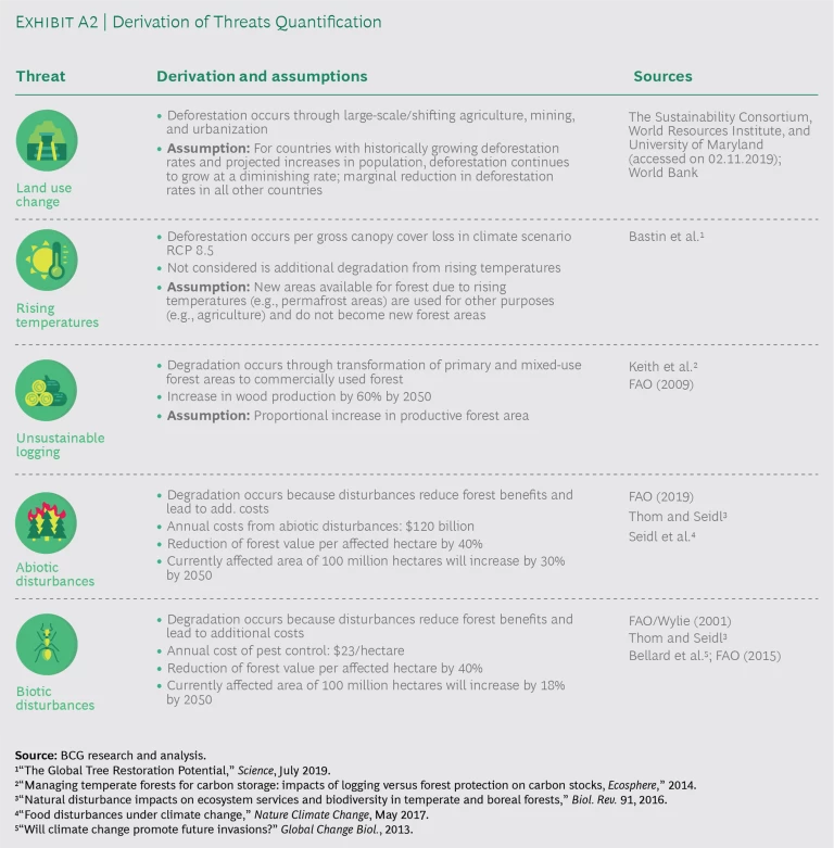 We calculate the potential impact of each threat on the basis of a detailed literature review and extrapolation of current trends. (See Exhibit A2). The baseline for our threats analysis is today’s forest value. As a result, areas that are already degraded are reflected in our current forest value calculation and are not incorporated into the projected threat calculation. Also, our calculations of the impact of threats assume that no action is taken in any of the areas (afforestation, for example) that can preserve forest value.