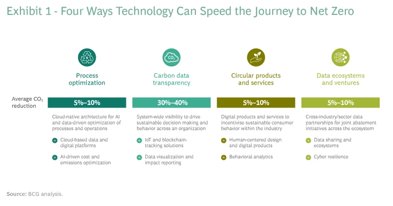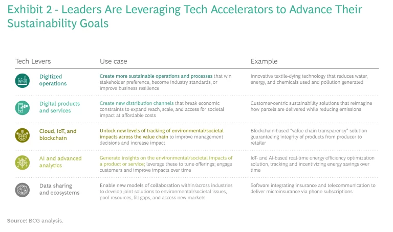 There are a number of examples that showcase how leaders have effectively leveraged these new approaches to technology to accelerate their sustainability transformations. (See Exhibit 2.)
