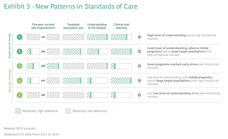 Diseases for which the SoC is changing quickly fall into two categories. In the first category are diseases characterized by a very high level of understanding, which drives a relatively high level of clinical-trial activity; in the second category are diseases with either poor initial prognoses or large target populations, combined with a relatively high level of understanding, which similarly drive a high level of clinical-trial activity. Diseases for which the SoC is evolving slowly fall into three categories: diseases with favorable prognoses reached early on, resulting in limited clinical-trial activity; diseases that are not well understood, although poor initial prognoses and/or large target populations drive a high level of clinical-trial activity; and diseases that are poorly understood, resulting in a low level of clinical-trial activity. (See Exhibit 3.)
